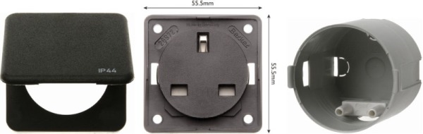 I purchased 2 UK domestic twin 13A sockets plus 2 new Berker sockets. The Berker sockets are made up from 3 parts, allowing selection of UK style rather than the European ones fitted by Jeanneau. The Berker cover, frame and wall box are shown below.
